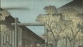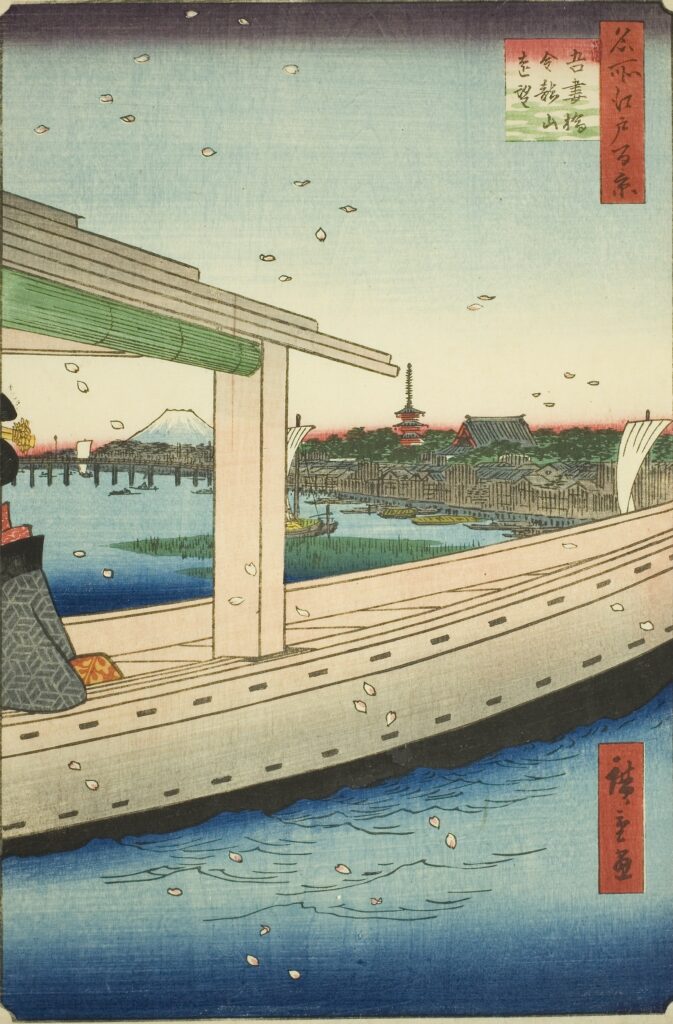 “Distant View of Azumabashi and Kinryuzan” depicts a view of Asakusa’s famous Sensoji Temple (Kinryuzan) in the distance, seen from across the Azumabashi Bridge over the Sumida River.