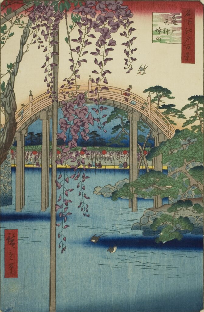 “Kameido Tenjin Shrine Grounds” is set at Kameido Tenjin Shrine, renowned as one of Edo’s finest plum and wisteria viewing spots.