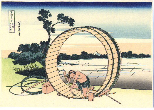 Hokusai’s playfulness can also be felt in the combination of the large circle of the bucket and the small triangle of Mt. Fuji.